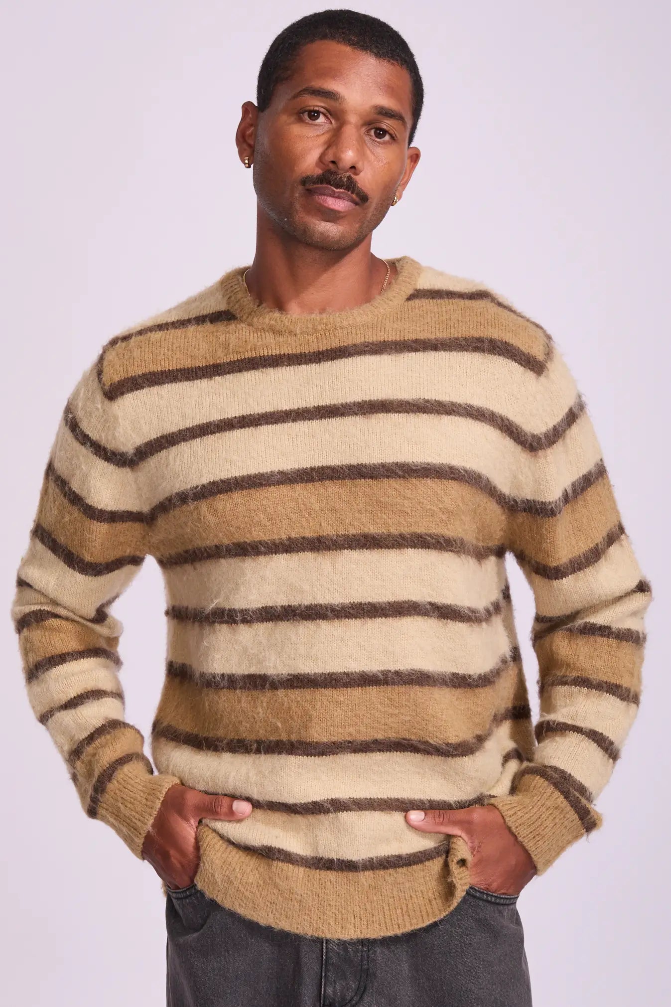 The Rhythm Mohair Striped Knit in Bark is a standout cold-weather knit with a soft, textured feel.